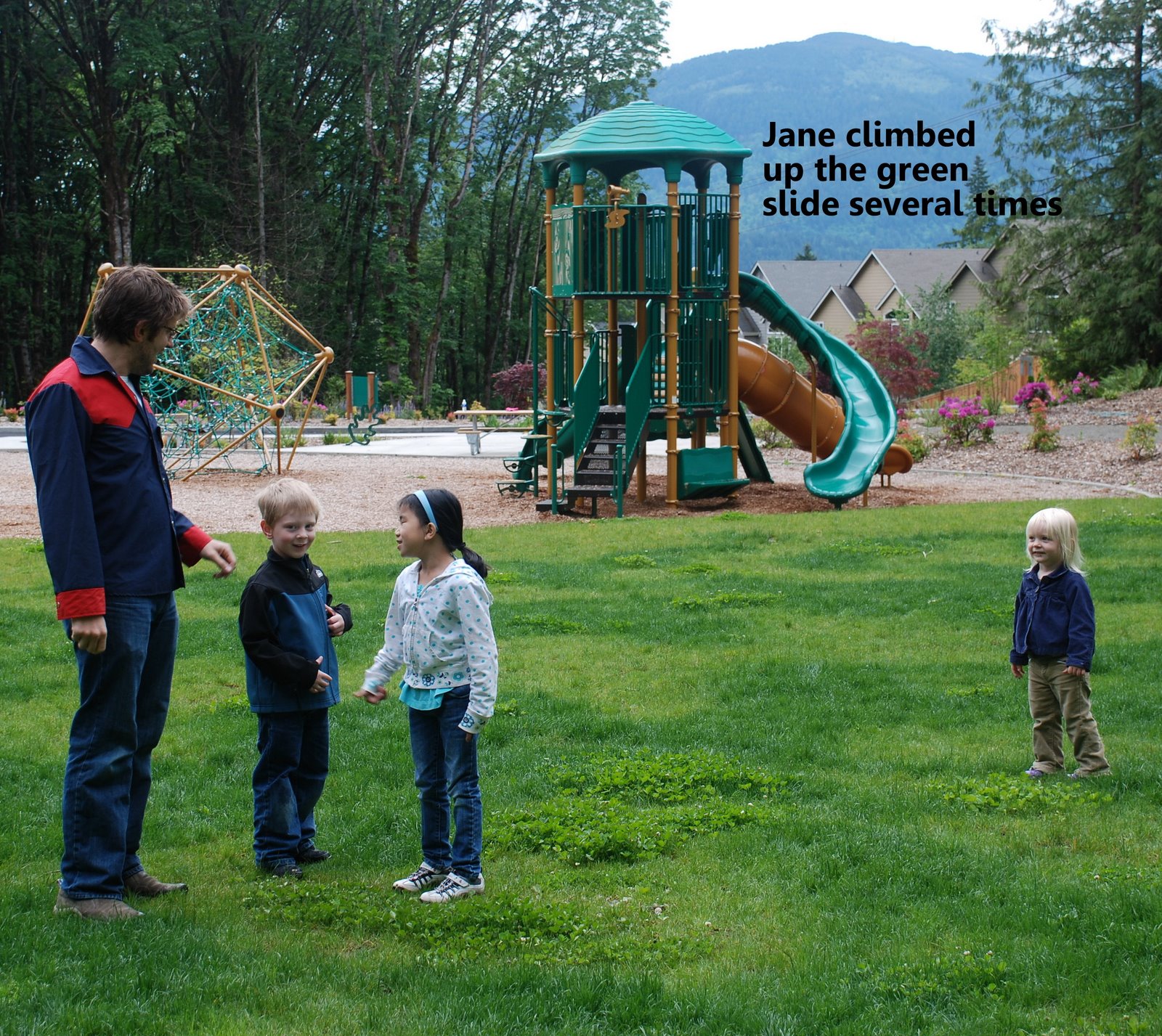 I marked in the photo afew above to show the slide Jane was climbing up. It was a three story play structure and she would just climb right up. No fear on her side, made me quite nervous.
